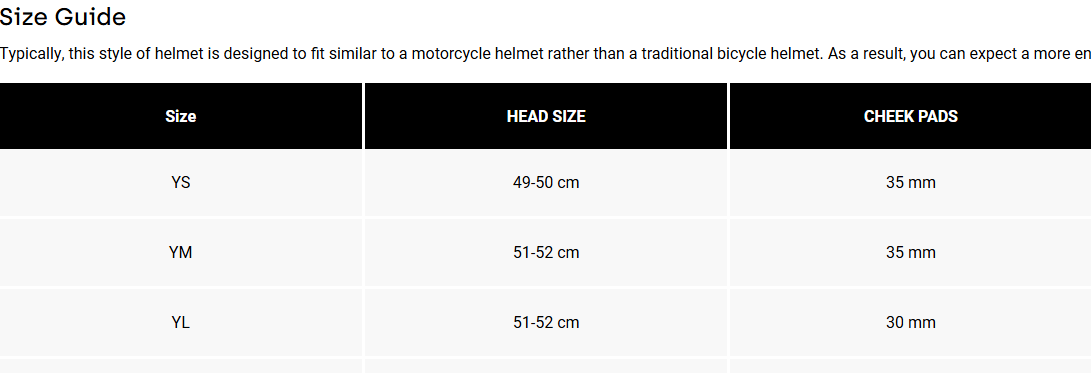 Storlekar: YS (49-50 cm / Cheek pads 35 mm), YM (51-52 cm / Cheek pads 35 mm), YL (51-52 cm / Cheek pads 30 mm)