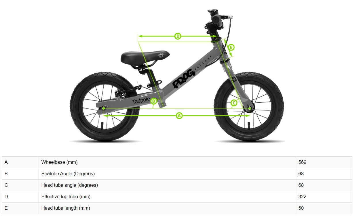 Tadpole är den perfekta första cykeln för småbarn, och är ett utmärkt sätt att introducera barnen för att cykla och utveckla en bra cykelbalans. Den har en lätt och robust ram och är lätt att bära för vuxna. Den har också bakbroms med bromsreglage på styret för att bekanta barnet med hur bromsning på cyklar görs. Den har en snabbkoppling som gör det enkelt att justera sadelns höjd, och styret har ett lås som förhindrar att barnet vrider styret under användning.