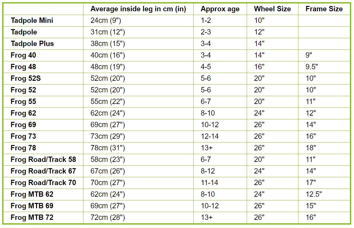 Frog 48 passar barn i åldern 4-5 år med cirka 44 cm benlängd. Frog rekommenderar inte att man köper en cykel som barnet kan växa ut till, eftersom det kan ha motsatt effekt genom att barnet börjar ogillar cykling eftersom cykeln blir för stor. Det bästa sättet att hitta rätt storlek är att mäta längden på barnets ben. Kolla in Frogs storleksguide och FrogFit-appen för att hitta den bästa storleken för ditt barn.