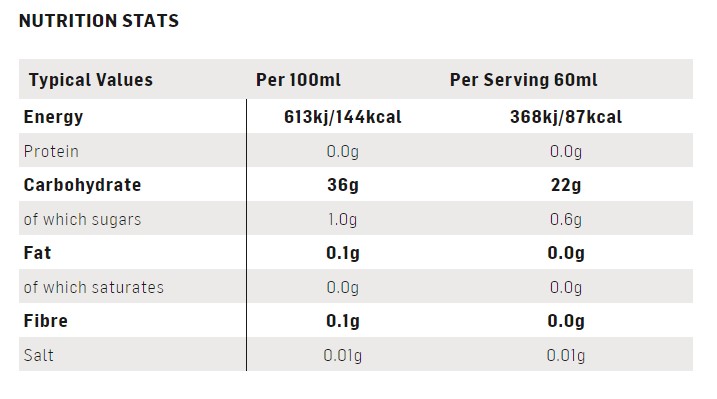 • Ingredienser: Water, Maltodextrin (from Maize) (33%), Gelling Agents (Gellan Gum, Xanthan Gum), Natural Flavouring, Acidity Regulators (Citric Acid, Sodium Citrate), Preservatives (Sodium Benzoate, Potassium Sorbate), Sweetener (Acesulfame K), Sodium Chloride, Antioxidant (Ascorbic Acid)