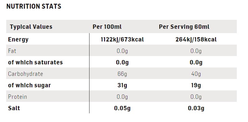 Ingredienser: Water, Maltodextrin (from Maize) (29%), Fructose (22%), L-Taurine, Cognizin(R) Citicoline, Caffeine Anhydrous, L-Theanine, Flavourings, Acidity Regulators (Citric Acid, Sodium Citrate), Gelling Agents (Gellan Gum, Xanthan Gum), Preservatives (Sodium Benzoate, Potassium Sorbate), Sodium Chloride