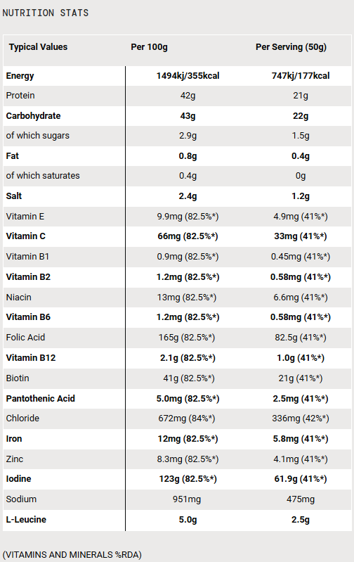 Ingredienser: Soya Protein Isolate (48%), Maltodextrin (40%), Fat-Reduced Cocoa Powder, Flavourings, L-Leucine, Sodium Chloride, Sweetener (Sucralose), Vitamin and Mineral Blend (Vitamin C, Niacin, Ferric Pyrophosphate, Vitamin E, Zinc Sulphate, Pantothenic Acid, Vitamin B6, Vitamin B2, Vitamin B1, Folic Acid, Potassium Iodide, Biotin, Vitamin B12), Thickener (Xanthan Gum).