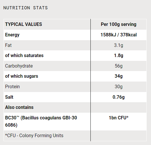 Ingredienser: Carbohydrate Blend (53%) (Maltodextrin, Fructose), Whey Protein Concentrate (Milk) (37%) (contains Emulsifier: Lecithins), Fat Reduced Cocoa Powder, Sugar, Flavouring, Salt, Thickener (Xanthan Gum), BC30™ (Bacillus coagulans GBI-30 6086 (Soya)).