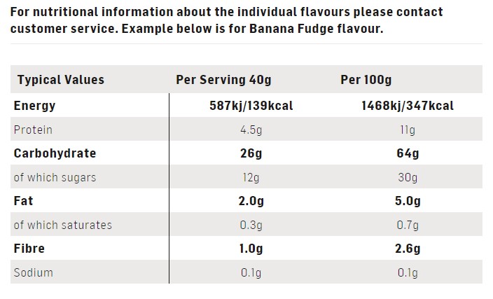 - Ingredienser: Fruit Juices From Concentrate 31% (Grape, Pineapple), Dried Fruits 26% (Dates, Banana, Apricots), Cereal 18% (Rice & Soy Crisp (Rice Flour, Soy Protein Isolate, Oat Flour, Salt, Vegetable Oil, Lecithin) (Gluten), Oats (Gluten)), Maltodextrin (from Maize), Soy Protein Isolate, Emulsifier (Soy Lecithin), Flavouring, Humectant (Calcium Lactate)